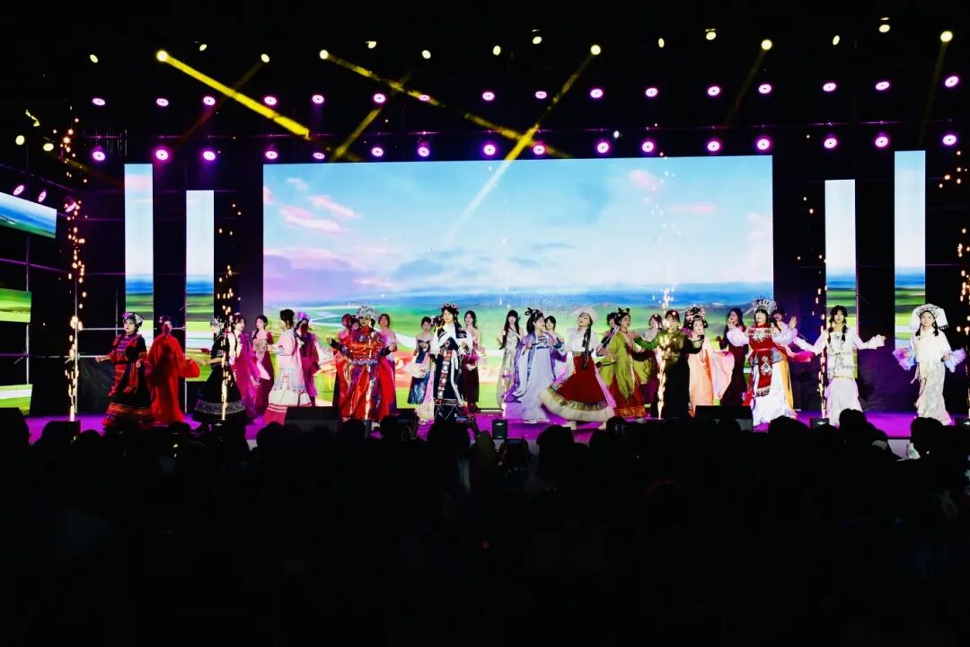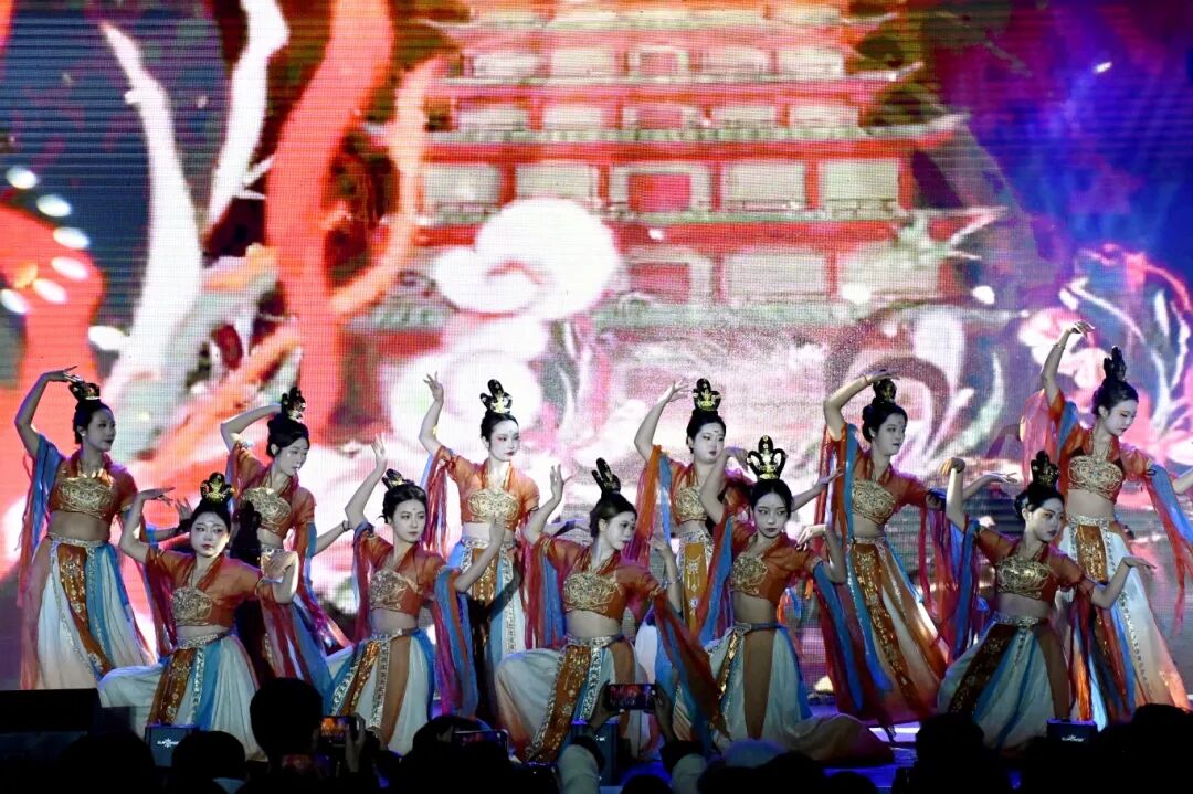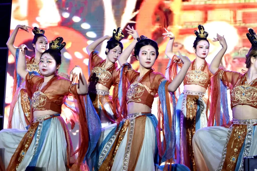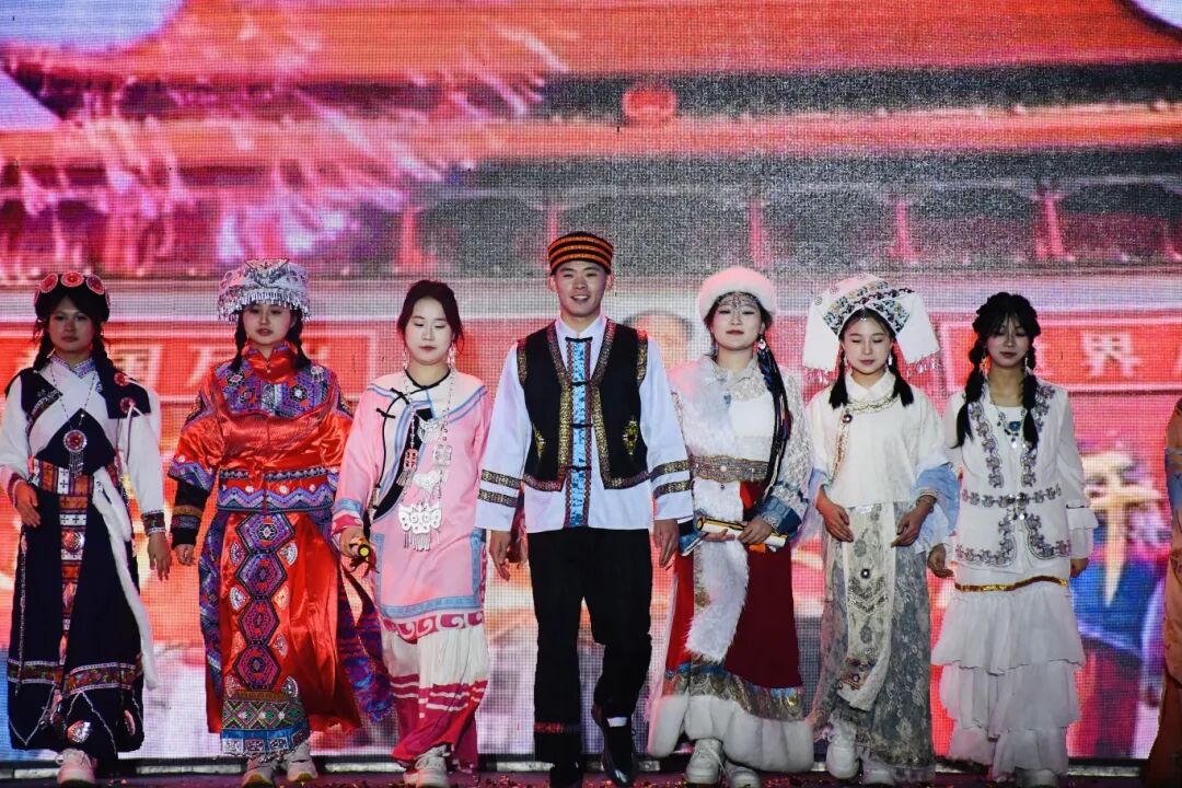 民族舞《葡萄架下的篝火》画面感十足,舞者们欢快奔放、笑容真挚灿烂,仿佛将观众带入瓜果飘香、各族同胞欢聚一堂的美好情境;舞蹈《大山》情感深沉、意境悠远,以细腻的肢体语言,展现出对大山的眷恋与对美好生活的向往;朗诵《跨越八十年的家国情怀》以时间为轴、以情感为线,带领观众穿梭于八十年的时代长河,重温家国记忆、传承红色精神,字字叩击人心;舞蹈《敦煌飞天》惊艳亮相,舞者们仿佛缓缓苏醒的飞天舞女,抖落衣袂尘埃,飞向梦幻的艺术苍穹,让大家感受到中华传统文化的博大精深;教师独唱《阳光路上》旋律昂扬、歌声嘹亮,以饱满的情感,唱出了对美好生活的赞美与对未来的坚定信心;走秀《新生万象・衣脉相承》将晚会气氛推向高潮,模特们身着融合各朝代文化底蕴、各民族精神内核与现代设计创意的华服依次登场,尽显东方美学的典雅与厚重,生动诠释了“各民族文化交相辉映、共生共荣”的深刻内涵。